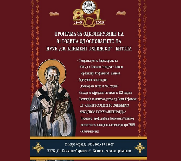 Програма за одбележување на 81 година од основањето на НУУБ „Св. Климент Охридски“ – Битола 23 Mar, 2026 | Настани